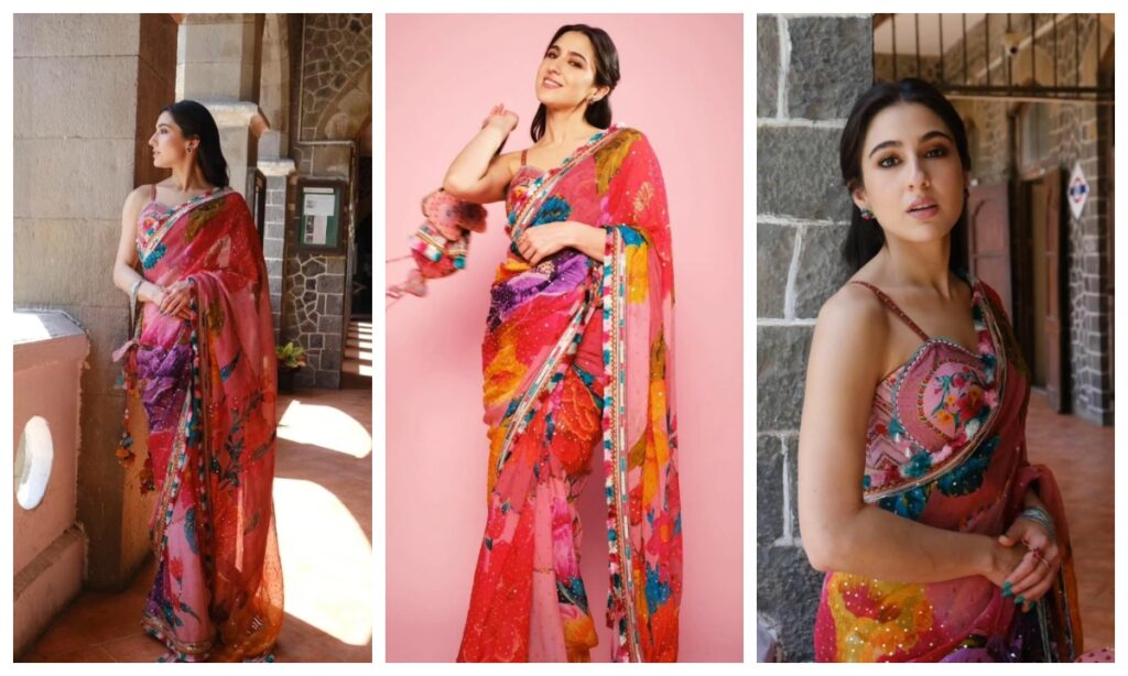 कलरफुल जॉर्जेट साड़ी में सारा अली खान का इंडियन लुक देखने लायक है. आप भी उनकी तरह ब्रालेट ब्लाउज पहनकर अपने साड़ी लुक को फ्लॉन्ट कर सकती हैं.