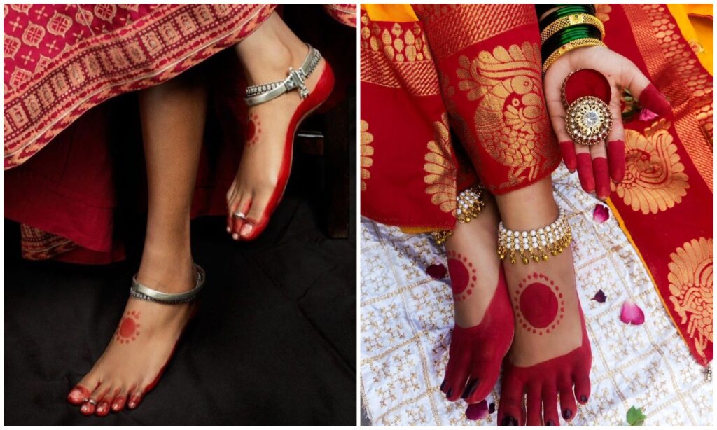 सबसे आसान और क्लासिक डिज़ाइन जिसमें पैरों के बीचों बीच गोल अल्ता की टिक्की लगाई जाती है. ये लुक सिंपल होते हैं लेकिन प्रोपर ट्रेडिशनल लगते हैं. इस तरह के सिंपल आल्ता डिजाइन अब मॉर्डन लड़कियों की भी पसंद बन चुके हैं.