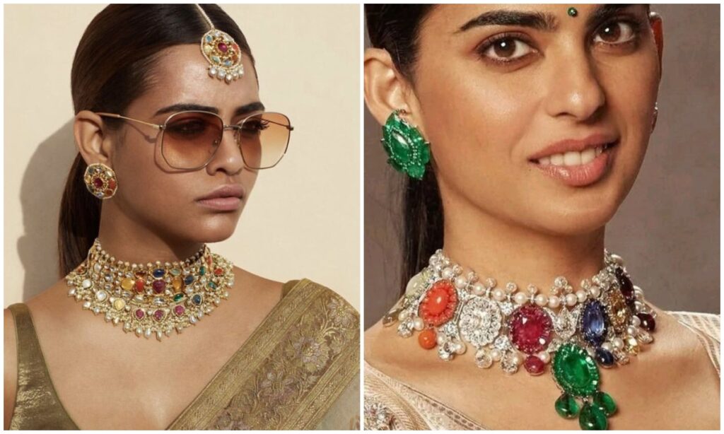 कलरफुल नवरत्न जूलरी हर साड़ी के साथ मैच हो जाती है. इसे आप बनारसी, कांजीवरम या पटोला जैसी हैवी साड़ियों के साथ पेयर कर सकती हैं. इस तरह की जूलरी आपके पार्टी लुक को परफेक्ट बना देती है.