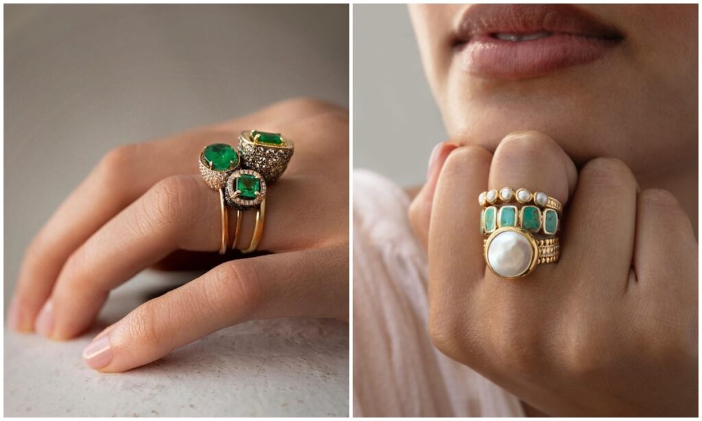 साल 2025 में रिंग्स को लेयर करके पहनना काफी पॉपुलर हो चुका है. एक साथ 3 4 पतली, अलग अलग डिज़ाइन की अंगूठियां आपके हाथों को ग्लैमरस फिनिश देती है. आप वेस्टर्न और इंडियन, दोनों तरह के कपड़ों के साथ इन्हें पहन सकती हैं.