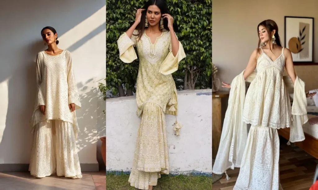 अगर आप सिंपल लुक पसंद करती हैं, तो व्हाइट या पेस्टल कलर का चिकनकारी शरारा आपके लिए परफेक्ट रहेगा. लखनऊ की मशहूर हाथ की कढ़ाई वाले ये सूट ईद की सुबह की नमाज और फैमिली गेट-टुगेदर के लिए एकदम सही है.
