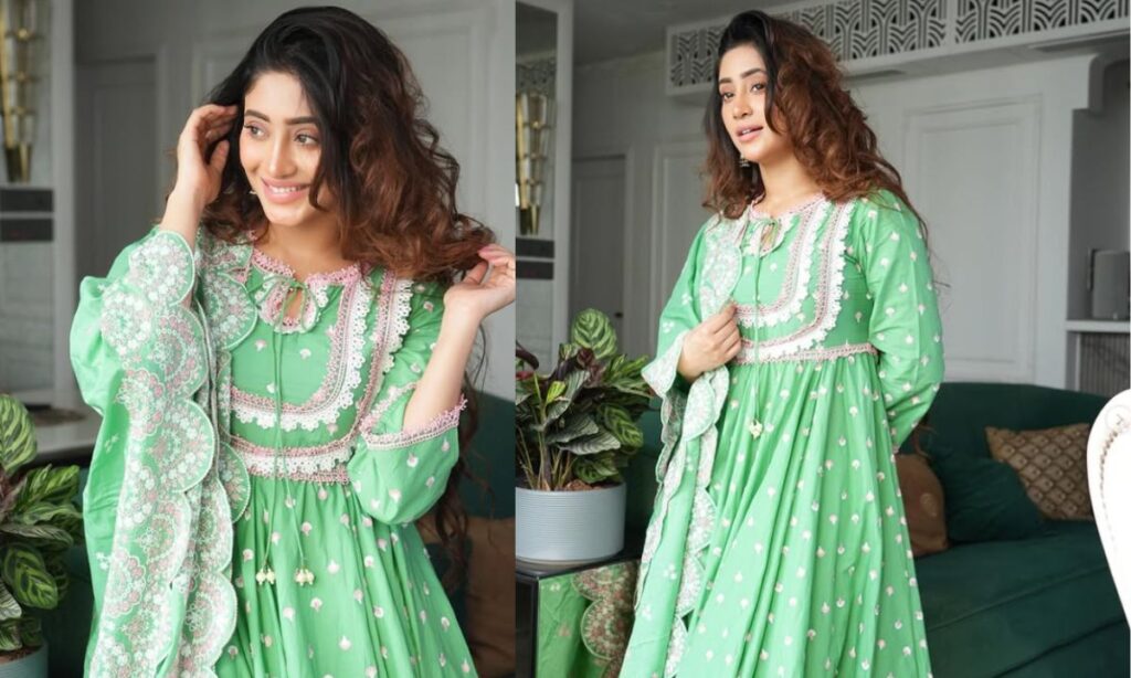 कॉटन का ये लाइट ग्रीन अनारकली सूट में प्यारी लग रही हैं. इसके साथ उन्होंने इयररिंग्स कैरी किया है और इसके साथ बालों को खुला छोड़ा है. अपने लुक को पूरा करने के लिए माथे पर छोटी सी बिंदी लगाई है.
