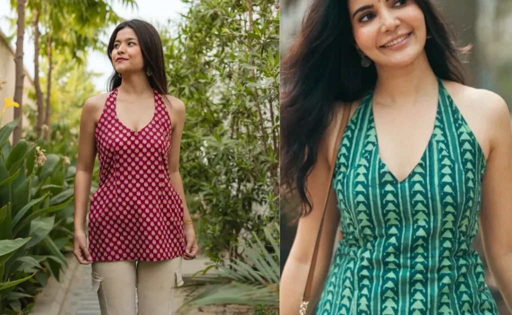 यह हॉल्टर नेक कुर्ती कैजुअसल आउटिंग के लिए अच्छी है. इस तरह की कुर्ती भी बहुत स्टाइलिश और बोल्ड लुक देती है. आप इसे पलाज़ो और जींस के साथ पेयर करके एक शानदार आउटफिट बना सकती हैं. एस्थेटिक लुक के लिए, इसे सिल्वर इयररिंग्स और बैंगल के साथ ज़रूर पेयर करें.