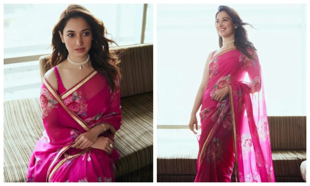 गुलाबी रंग की प्रिंटेड ऑर्गेंज़ा साड़ी को तमन्ना भाटिया ने मैचिंग स्लीवलेस ब्लाउज के साथ पहना था. इन गर्मियों में आप भी इस तरह का लुक ट्राई कर सकती हैं.