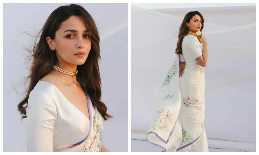 आलिया भट्ट ने सब्यसाची की खूबसूरत प्रिंटेड साटन साड़ी को मैचिंग कलर के प्लंजिंग नेक लाइन वाले ब्लाउज के साथ पेयर किया. समर सीजन के लिए उनका ये लुक परफेक्ट लग रहा है.