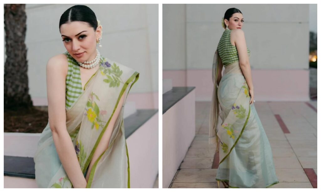 प्रिंटेड कॉटन साड़ियां गर्मियों के लिए परफेक्ट मानी जाती हैं. यहां एक्ट्रेस हंसिका मोटवानी ने अपनी फ्लोरल प्रिंट वाली साड़ी को मैचिंग शेड वाले शर्ट स्टाइल ब्लाउज के साथ पेयर किया.