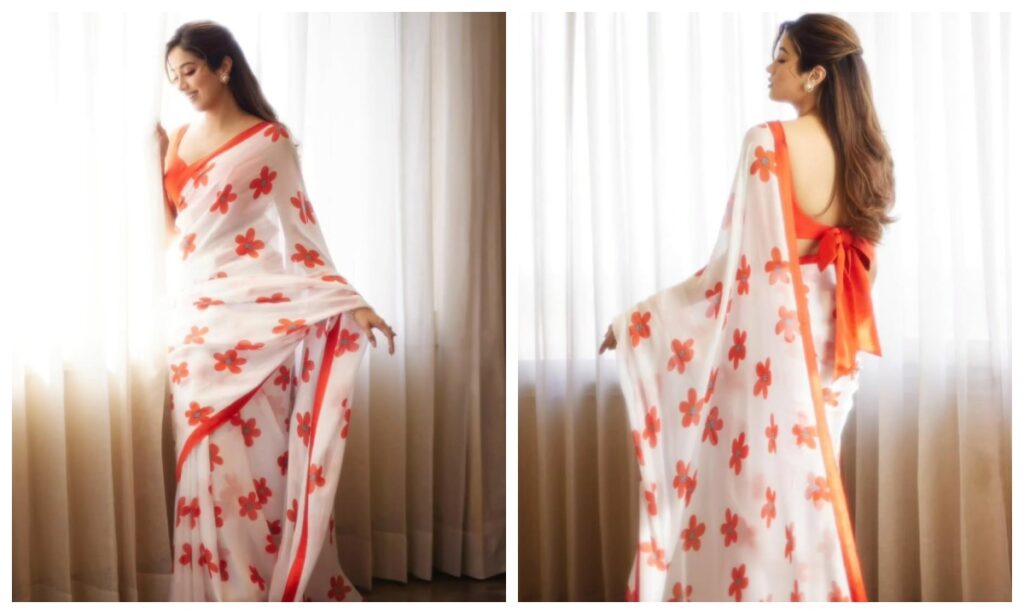 व्हाइट और ऑरेंज कलर की प्रिंटेड साड़ी में जान्हवी कपूर बहुत ही प्यारी लग रही हैं. अगर आप भी उनके जैसा लुक चाहती हैं तो साड़ी को नॉटेड ब्लाउज के साथ पेयर करें.