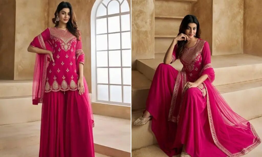 डार्क पिंक जॉर्जेट फैब्रिक में बना यह शरारा सूट सादगी में भी रॉयल फील देता है. गले पर महीन एम्ब्रॉयडरी और साथ में हेवी वर्क वाला दुपट्टा इसे ईवनिंग फंक्शन्स के लिए परफेक्ट बनाता है.