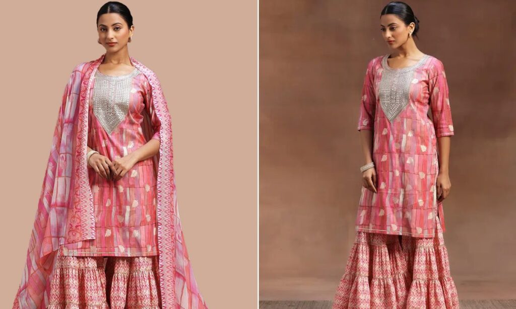 इस सॉफ्ट पिंक शरारा सूट में सिल्वर सीक्विन से सजी नेकलाइन और मैचिंग ब्लॉक प्रिंटेड शरारा पैंट्स हैं. इसका लुक वाइब्रेंट पिंक एंड व्हाइट प्रिंटेड दुपट्टे से पूरा होता है, जो इस ईद पर आपको देगा एक फ्रेश और फेस्टिव लुक.