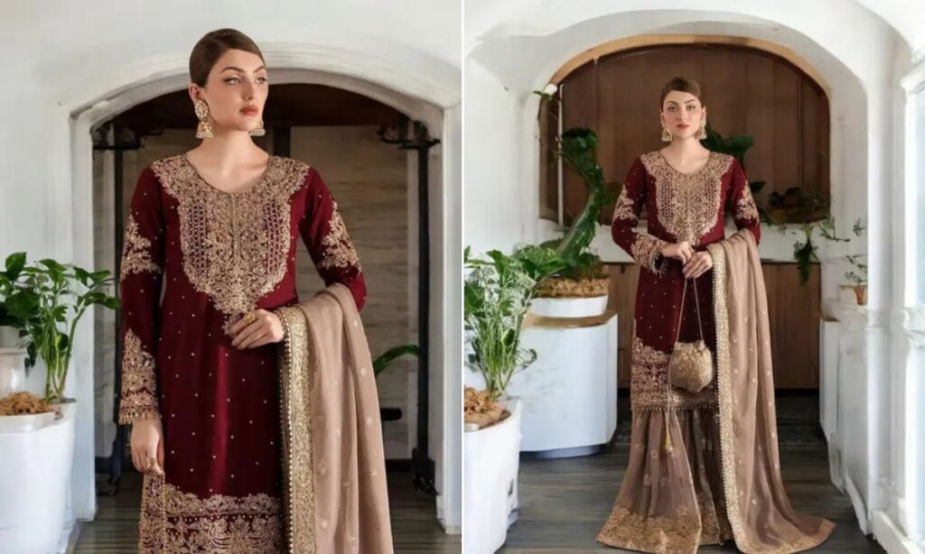 गहरे मैरून रंग के इस सूट पर गोल्डन एम्ब्रॉयडरी इसे रिच लुक देती है. साथ में बीज कलर का हेवी दुपट्टा कॉन्ट्रास्ट बनाता है और आउटफिट को और ज्यादा एलीगेंट बना देता है. ईद की ग्रैंड सेलिब्रेशन के लिए एकदम सही चॉइस.