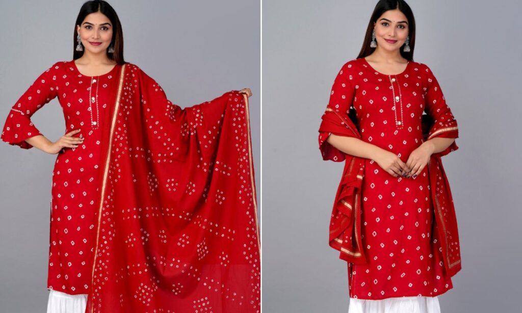 रेड कलर का यह बांधनी प्रिंटेड शरारा सूट पारंपरिकता से भरपूर है. इसके साथ मैच करता गोल्ड गोटा पट्टी वर्क वाला हेवी दुपट्टा जो आपके लुक को दे ट्रेडिशनल और ग्लैमरस टच.