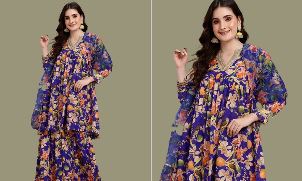 डार्क ब्लू बेस पर बना यह फ्लोरल प्रिंट शरारा सूट ब्यूटी विद एलिगेंस का परफेक्ट कॉम्बिनेशन है. इसे मैच किया गया है नेट के दुपट्टे के साथ, जिसमें एम्बेलिश्ड बॉर्डर है, जो आपके ईद लुक को दे एलिगेंस टच.