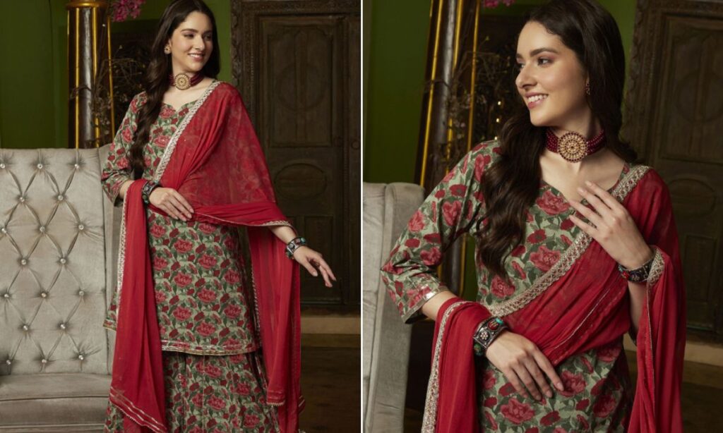 ग्रीन कलर का यह फ्लोरल प्रिंटेड शरारा सूट सिंपल होने के बावजूद बेहद स्टाइलिश है. इसके साथ रेड कलर का गोल्ड बॉर्डर वाला हेवी दुपट्टा ईद के त्योहार के लिए बिलकुल परफेक्ट है, खासकर दिन या रात दोनों इवेंट्स में ये आपको देगा एलिगेंट लूक.