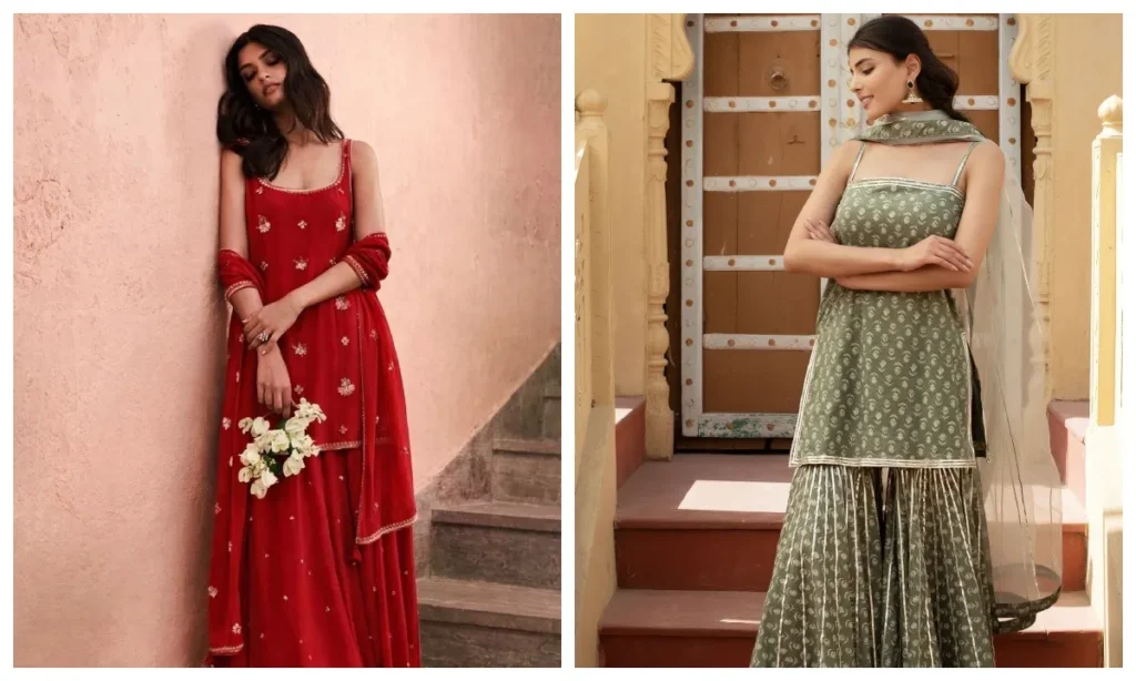 अगर आप बोरिंग कट्स से हटकर कुछ ट्राई करना चाहती हैं, तो शॉर्ट स्लीवलेस कुर्ता और शरारा का कॉम्बिनेशन बेस्ट है. ये न सिर्फ पहनने में लाइटवेट होता है, बल्कि आपकी हाइट को भी थोड़ा लंबा दिखाता है. ब्राइट कलर्स में ये सेट आपको किसी भी गेट-टुगेदर की जान बना देगा.