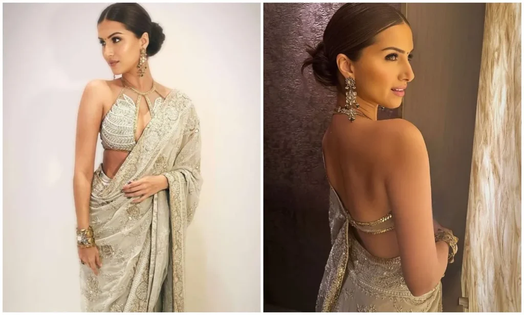 डिजाइनर सिल्वर साड़ी के साथ तारा सुतारिया ने पर्ल डिटेल वाला हॉल्टर नेक ब्लाउज़ पहना था. फ्लोरल मोटिफ्स और शीर नेकलाइन वाले ब्लाउज ने तारा के इस साड़ी लुक ग्लैमरस टच दिया.