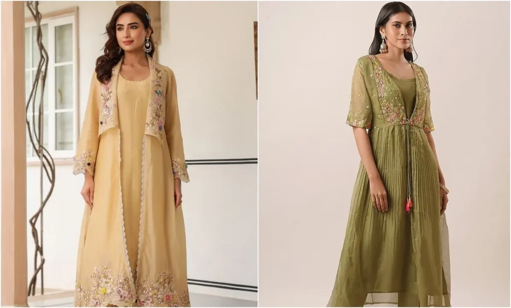 मॉर्डन और पारंपरिक लुक का सही बैलेंस चाहिए, तो आप जैकेट स्टाइल वाला कुर्ता सेट अपने लिए खरीद सकती हैं. इसमें थ्रेड वर्क की फाइन डिटेलिंग आपको और भी स्टाइलिश लुक दे सकती है.