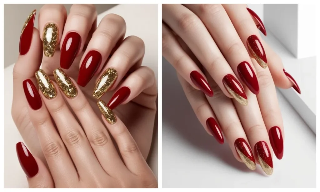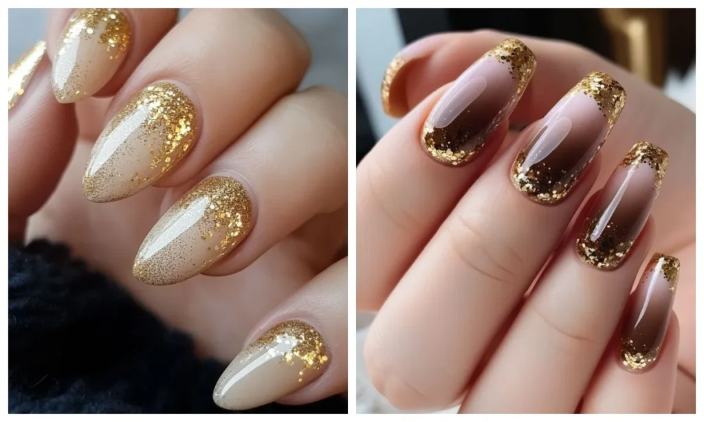 ओम्ब्रे लुक अभी भी सबसे हॉट ट्रेंड्स में से एक है. बेस पर न्यूड या क्रीमी शेड और नेल टिप्स पर गोल्ड ग्लिटर का ये कॉम्बिनेशन हमेशा कमाल लगता है. ये डिज़ाइन एलीगेंट भी है और फेस्टिव वाइब्स भी देता है. खासकर इंडियन आउटफिट के साथ इस तरह के नेल्स एकदम परफेक्ट लगते हैं.