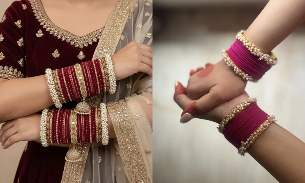 अगर आप कुछ लाइटवेट और शाइनी चाहती हैं, तो वेलवेट और मैटेलिक फिनिश वाली चूड़ियों का सेट ट्राई कर सकती हैं. ये फ्यूजन स्टाइल ट्रेडिशनल और मॉडर्न दोनों तरह के आउटफिट्स पर सूट करता है.