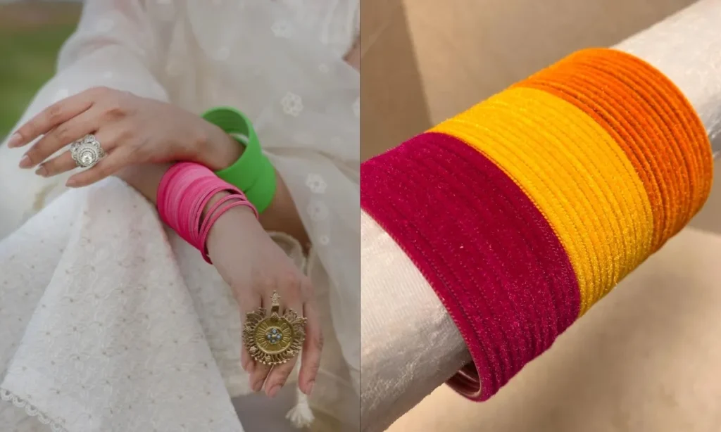 पुराने मैरून और रेड के अलावा अब मिंट ग्रीन, पीच, और लैवेंडर जैसे पेस्टल कलर्स भी काफी ज्यादा डिमांड में आ चुके हैं. इस तरह के वेलवेट बैंगल सेट्स को आप इंडो-वेस्टर्न ड्रेसेस के साथ आसानी से पेयर कर सकती हैं.