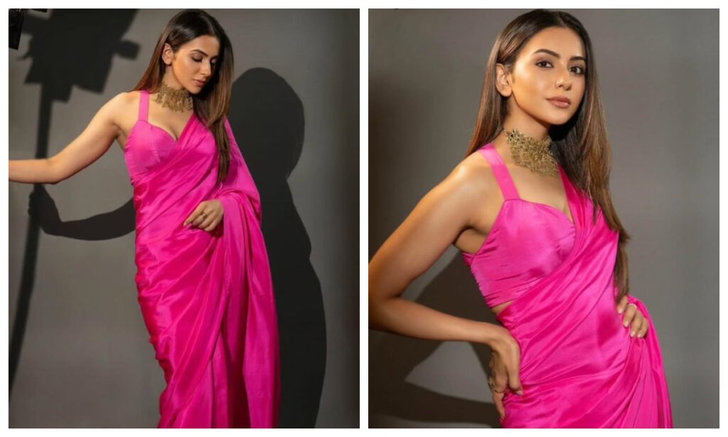 अगर आपको भी डॉर्क सॉलेड कलर पसंद हैं, तो फिर रकुल प्रीत सिंह की तरह गुलाबी साटन साड़ी पहन सकती हैं. उन्होंने इस पार्टी वियर साड़ी को मैचिंग स्ट्रेपी ब्लाउज के साथ पहना. स्ट्रेट हेयर और चोकर हार के साथ एक्ट्रेस ने इस लुक को पूरा किया.