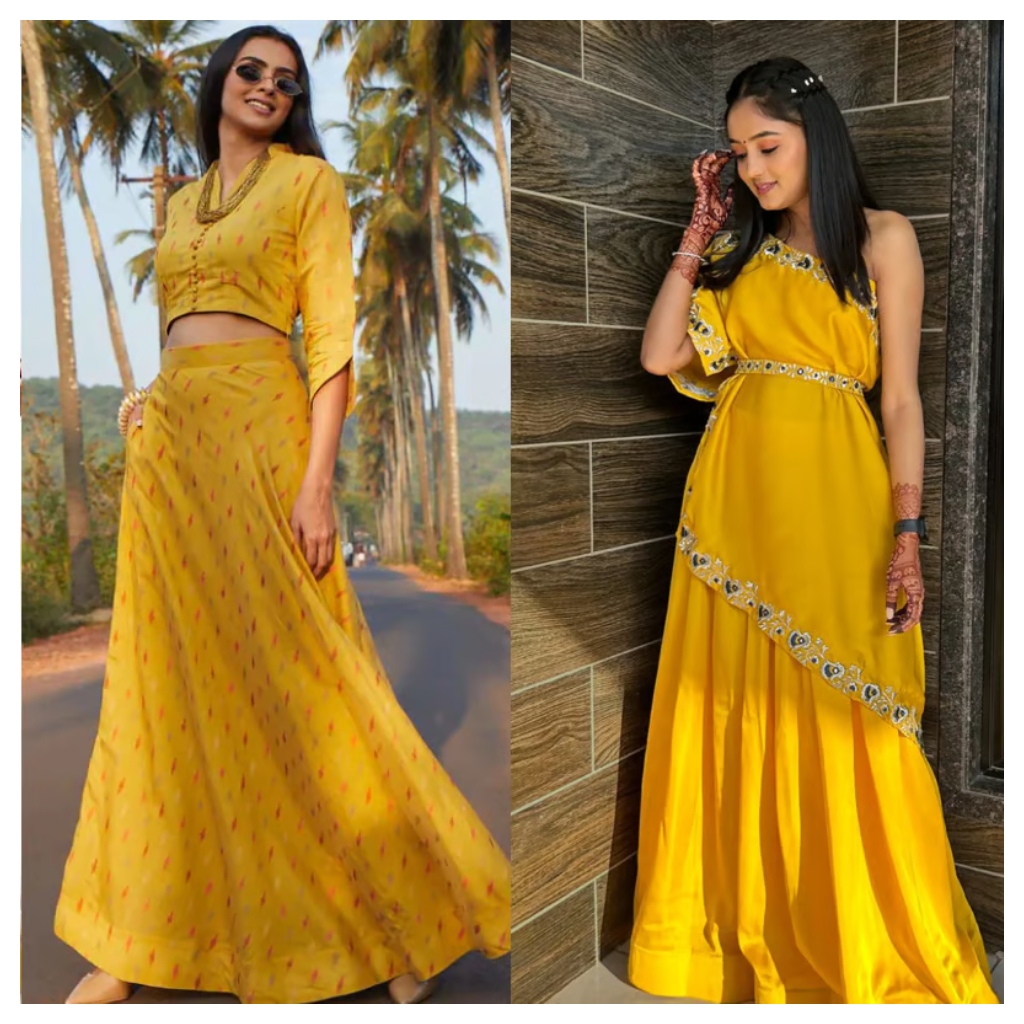 बसंत पंचमी के अवसर पर येलो स्कर्ट-टॉप का चुनाव भी कर सकती हैं। इस आउटफिट में आपको ट्रडिशनल और मॉर्डन लुक मिलता है। अगर आप चाहें तो इसको ऑफिस में कैरी कर सकती हैं।