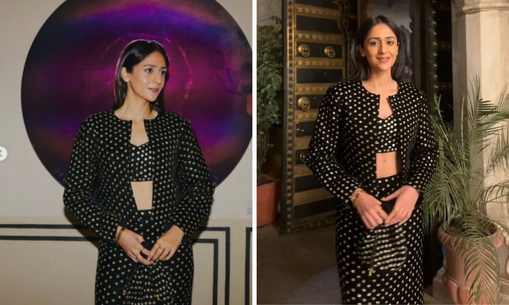 गौरवी ने पोल्का डॉट प्रिंट वाला ब्लैक को-ऑर्ड सेट पहना, जिसमें क्रॉप टॉप, स्कर्ट और राउंड नेक जैकेट है. उन्होंने इस लुक को मिनिमल मेकअप, सिंपल हेयर और पोटली बैग के साथ कम्प्लीट किया. ये लुक किसी फ्रेंड्स पार्टी या इवेंट के लिए बिल्कुल परफेक्ट है.