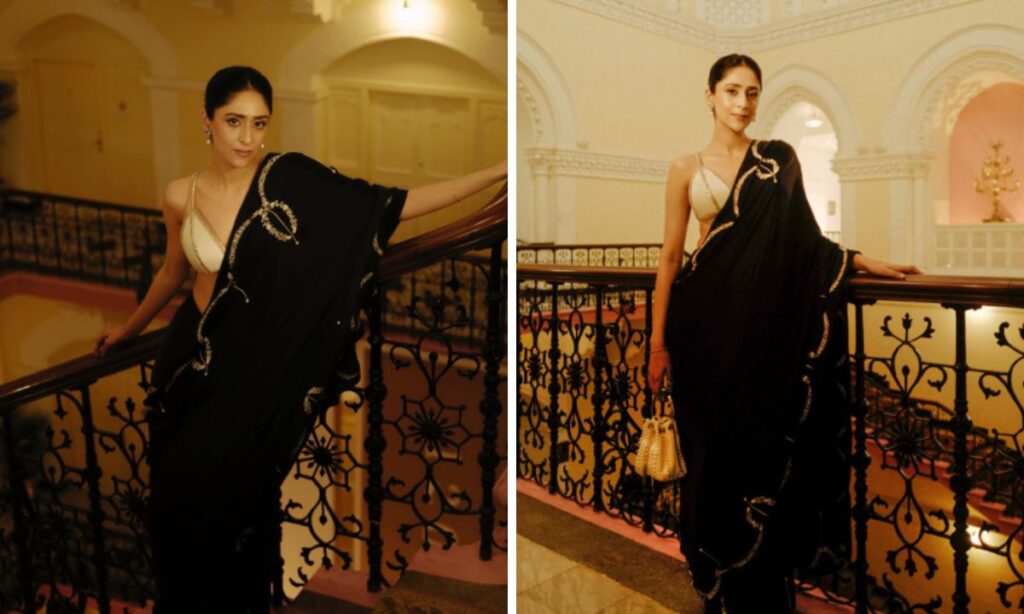 गौरवी ने ब्लैक सैटिन साड़ी को गोल्डन एंब्रॉयडरी के साथ पहना है. स्ट्रैपी ब्लाउज और ड्रॉप पर्ल ईयररिंग्स ने लुक को और रॉयल बना दिया है. यह आउटफिट खासकर तब जब आप वेस्टर्न और ट्रेडिशनल का परफेक्ट मिक्स चाहती हों.