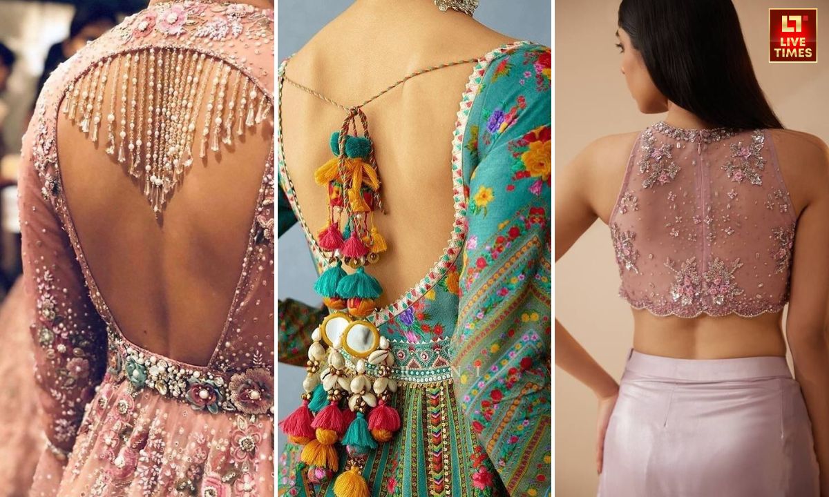 इस डिज़ाइन में डीप वी कट बैक होता है जिसे डोरी या लैटिस से टाई किया जाता है. यह स्टाइलिश और बोल्ड दिखता है और मॉडर्न ब्राइड्स की पहली पसंद बन चुका है.