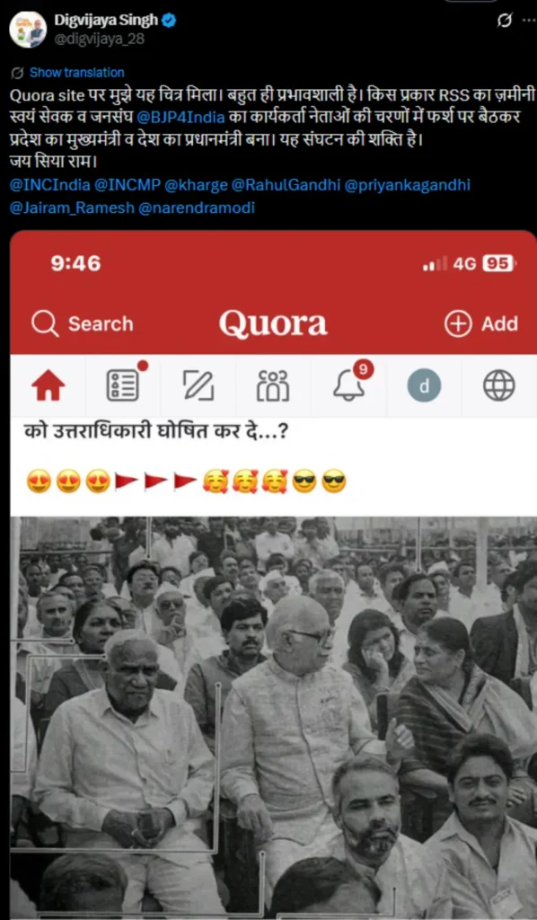 सिंह ने X पर एक पोस्ट में कहा “Quora साइट पर मुझे यह चित्र मिला. यह बहुत प्रभावशाली है. RSS के ज़मीनी ‘स्वयंसेवक’ और जनसंघ @BJP4India के कार्यकर्ता किस तरह नेताओं के पैरों में जमीन पर बैठे और राज्य के मुख्यमंत्री और देश के प्रधानमंत्री बन गए. यही संगठन की ताकत है. जय सिया राम.” CWC की बैठक के बाद प्रेस ब्रीफिंग में जब मीडिया ने उनके बयान पर सवाल पूछे तो उन्होंने कहा “असल में, मैंने पार्टी संगठन की तारीफ की थी. आप लोगों ने बातों को गलत समझा है. मैं BJP और RSS का कट्टर विरोधी हूं. मैं RSS और प्रधानमंत्री की नीतियों का हमेशा विरोधी रहा हूं और रहूंगा.”