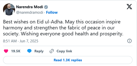 प्रधानमंत्री नरेन्द्र मोदी ने एक्स पर पोस्ट में कहा कि ईद-उल-अजहा की हार्दिक शुभकामनाएं. यह अवसर सद्भाव को प्रेरित करे और हमारे समाज में शांति के ताने-बाने को मजबूत करे.
