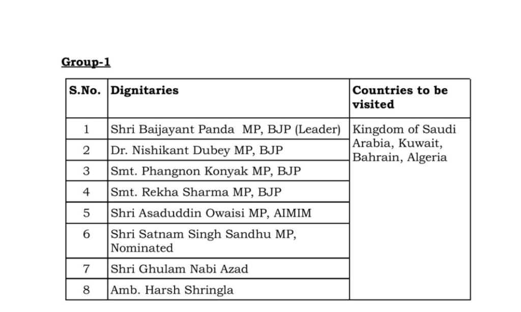 पहली टीम की अध्यक्षता बीजेपी सांसद बैजयंत पांडा करेंगे. इस टीम में कुल आठ सांसद शामिल हैं. ये टीम सऊदी अरब, कुवैत, बहरीन और अल्जीरिया का दौरा करेगी. इस टीम में बीजेपी सांसद निशिकांत दुबे, फांगोन कोन्याक, रेखा शर्मा शामिल हैं. इसके अलावा एआईएमआईएम सांसद असदुद्दीन ओवैसी, सतनाम सिंह संधू, गुलाम नबी आजाद और हर्ष सिंघला शामिल हैं.