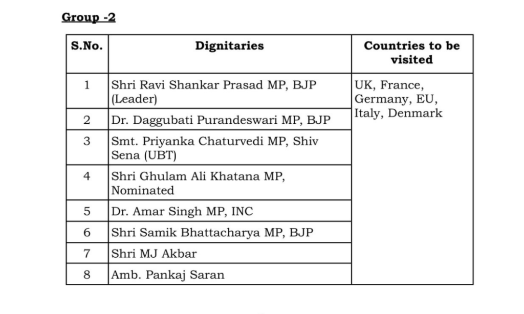 दूसरी टीम की अध्यक्षता बीजेपी सांसद रविशंकर प्रसाद करेंगे. ये टीम यूके, फ्रांस, जर्मनी, यूरोपीय यूनियन, इटली और डेनमार्क जाएगी. टीम में बीजेपी सांसद दग्गुबाती पुरंदेश्वरी, शिवसेना (यूबीटी) नेता प्रियंका चतुर्वेदी, गुलाम अली खटाना, कांग्रेस सांसद अमर सिंह, बीजेपी नेता समित भट्टाचार्य, एमजे अकबर और सांसद पंकज सरन शामिल हैं.
