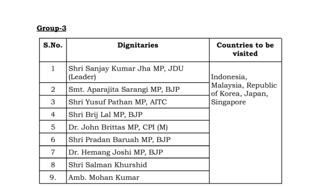 तीसरी टीम की अध्यक्षता जेडीयू के सांसद संजय कुमार झा करेंगे. ये टीम इंडोनेशिया, मलेशिया, कोरिया रिपब्लिक, जापान और सिंगापुर जाएगी. इस टीम में बीजेपी सांसद अपराजिता सारंगी, टीएमसी सांसद यूसुफ पठान, बीजेपी नेता बृज लाल, सीपीआई नेता जॉन ब्रिटास , प्रधान बरुआ, हेमांग जोशी, सलमान खुर्शीद और मोहन कुमार शामिल हैं.