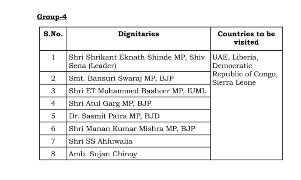 चौथी टीम की अध्यक्षता शिवसेना नेता श्रीकांत एकनाथ शिंदे करेंगे. ये टीम यूएई, लाइबेरिया, कॉन्गो और सिएरा लियोन जाएगी. इस टीम में दिल्ली की बीजेपी सांसद बांसुरी स्वराज, ईटी मोहम्मद बशीर, अतुल गर्ग, बीजेडी नेता सस्मित पात्रा, मनन कुमार मिश्रा, एसएस अहलुवालिया और सुजान चिनॉय शामिल हैं.