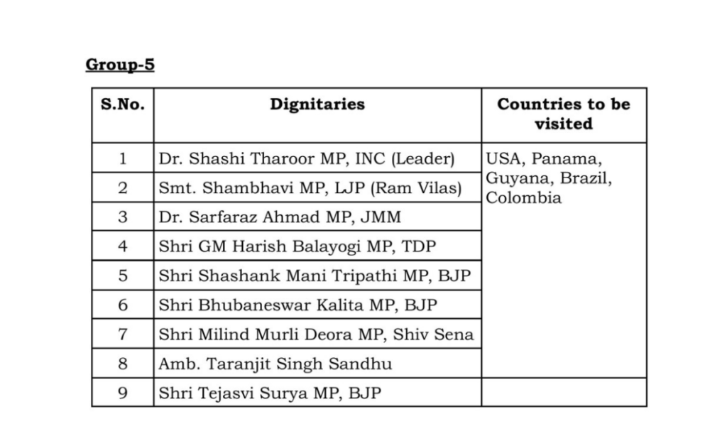पांचवीं टीम की अध्यक्षता कांग्रेस सांसद शशि थरूर करेंगे. ये टीम अमेरिका, पनामा, गुयाना, ब्राजील और कोलंबिया जाएगी. इस टीम में लोजपा सांसद संभावी, जेएमएम सांसद सरफराज अहमद, टीडीपी सांसद जीएम हरीश बालायोगी, बीजेपी सांसद शशांक मनी त्रिपाठी, भुवनेश्वर कलीता. मिलिंद मुरली देवड़ा, तरणजीत सिंह संधू और तेजस्वी सूर्या शामिल किए गए हैं.