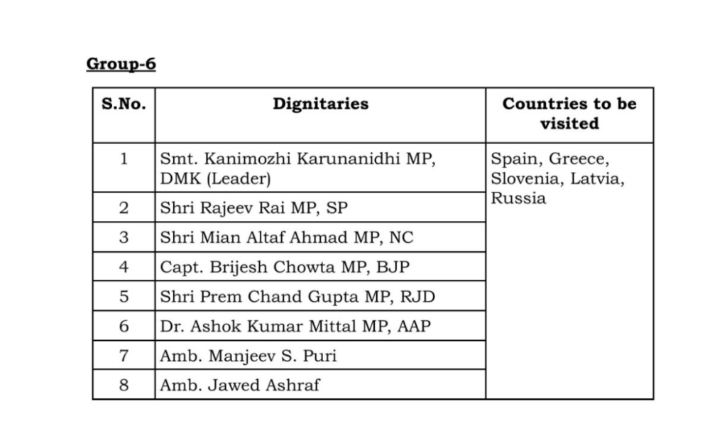 छठी टीम की अध्यक्षता डीएमके नेता कनिमोझी करुणानिधी करेंगी. ये टीम स्पेन, ग्रीस, स्लोवेनिया, लातविया और रूस जाएगी. इस टीम में एसपी सांसद राजीव राय, एनसी सांसद मियां अल्ताफ अहमद, बीजेपी सांसद बृजेश चौटा, आरजेडी सांसद प्रेम चंद गुप्ता, आप सांसद अशोक कुमार मित्तल, मंजीव एस पुरी और जावेद अशरफ शामिल हैं.