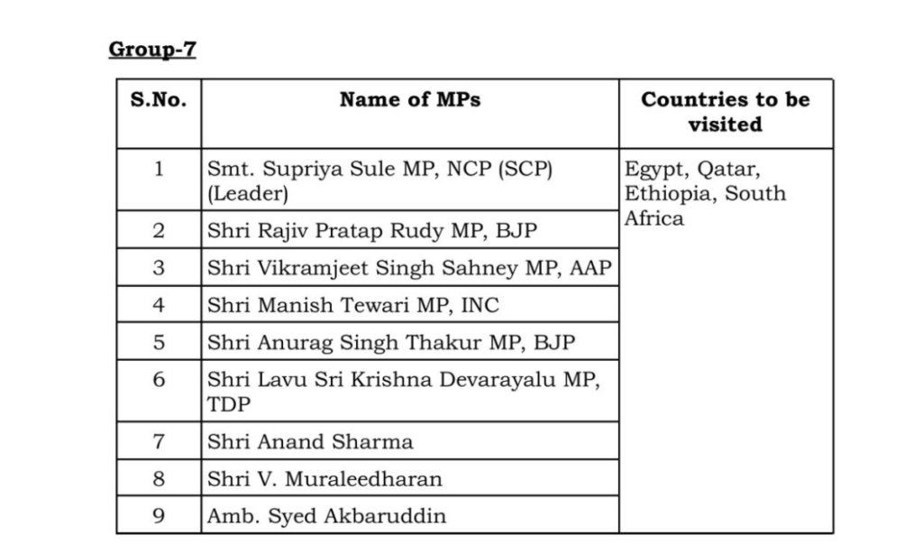 सातवीं टीम की अध्यक्षता एनसीपी (SCP) नेता सुप्रिया सुले करेंगी. ये टीम मिस्र, कतर, इथियोपिया और दक्षिण अफ्रीका जाएगी. इस टीम में बीजेपी नेता राजीव प्रताप रुडी, AAP सांसद विक्रमजीत सिंह साहनी, कांग्रेस नेता मनीष तिवारी, बीजेपी नेता अनुराग सिंह ठाकुर, टीडीपी नेता कृष्ण देवरायलू, आनंद शर्मा, वी मुरलीधरन और सैयद अकबरुद्दीन भी शामिल हैं.