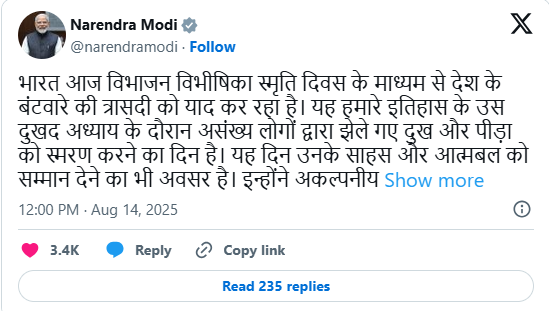 भारत इतिहास के दुखद अध्याय के दौरान अनगिनत लोगों की ओर से झेले गए उथल-पुथल और दर्द को याद करते हुए आज के दिन को #PartitionHorrorsRemembranceDay विभाजन विभीषिका स्मृति दिवस के रूप में याद करता है. यह उनके साहस का सम्मान करने का भी दिन है, अकल्पनीय क्षति का सामना करने और फिर भी नए सिरे से शुरुआत करने की ताकत पाने की उनकी क्षमता का सम्मान करने का दिन है. प्रभावित हुए कई लोगों ने अपने जीवन का पुनर्निर्माण किया और उल्लेखनीय उपलब्धियां हासिल कीं. यह दिन हमारे देश को एक सूत्र में पिरोने वाले सद्भाव के बंधन को मजबूत करने की हमारी स्थायी जिम्मेदारी की भी याद दिलाता है.