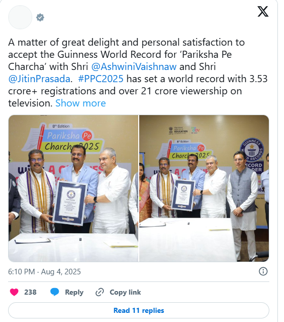 इस कार्यक्रम में केंद्रीय शिक्षा मंत्री धर्मेंद्र प्रधान; केंद्रीय इलेक्ट्रॉनिक्स एवं सूचना प्रौद्योगिकी, रेलवे और सूचना एवं प्रसारण मंत्री अश्विनी वैष्णव; केंद्रीय इलेक्ट्रॉनिक्स एवं सूचना प्रौद्योगिकी राज्य मंत्री जितिन प्रसाद; स्कूल शिक्षा एवं साक्षरता विभाग के सचिव संजय कुमार; MyGov के सीईओ श्री नंद कुमारम; और शिक्षा तथा इलेक्ट्रॉनिक्स एवं सूचना प्रौद्योगिकी मंत्रालयों के वरिष्ठ अधिकारियों के साथ-साथ अन्य प्रमुख हितधारक भी उपस्थित थे. गिनीज वर्ल्ड रिकॉर्ड्स के आधिकारिक निर्णायक ऋषि नाथ ने इस रिकॉर्ड की पुष्टि की और इसकी घोषणा की. इस अवसर पर बोलते हुए धर्मेंद्र प्रधान ने कहा कि प्रधानमंत्री नरेंद्र मोदी के दूरदर्शी नेतृत्व में, परीक्षा पे चर्चा को तनाव को सीखने के उत्सव में बदलकर परीक्षाओं के प्रति एक राष्ट्रीय दृष्टिकोण के रूप में पुनर्परिभाषित किया गया है. श्री प्रधान ने बताया कि पीपीसी के 8वें संस्करण को 2025 में सभी मीडिया प्लेटफार्मों पर कुल 21 करोड़ से अधिक दर्शकों ने देखा.