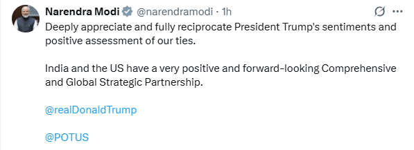 पीएम मोदी ने सोशल मीडिया प्लेटफॉर्म एक्स पर पोस्ट कर लिखा कि मैं राष्ट्रपति ट्रंप की भावनाओं का सम्मान करता हूं और दोनों देशों के संबंधों के प्रति उनके सकारात्मक आकलन की सराहना करता हूं. भारत और अमेरिका के बीच एक बहुत ही सकारात्मक और दूरदर्शी व्यापक एवं वैश्विक रणनीतिक साझेदारी है.