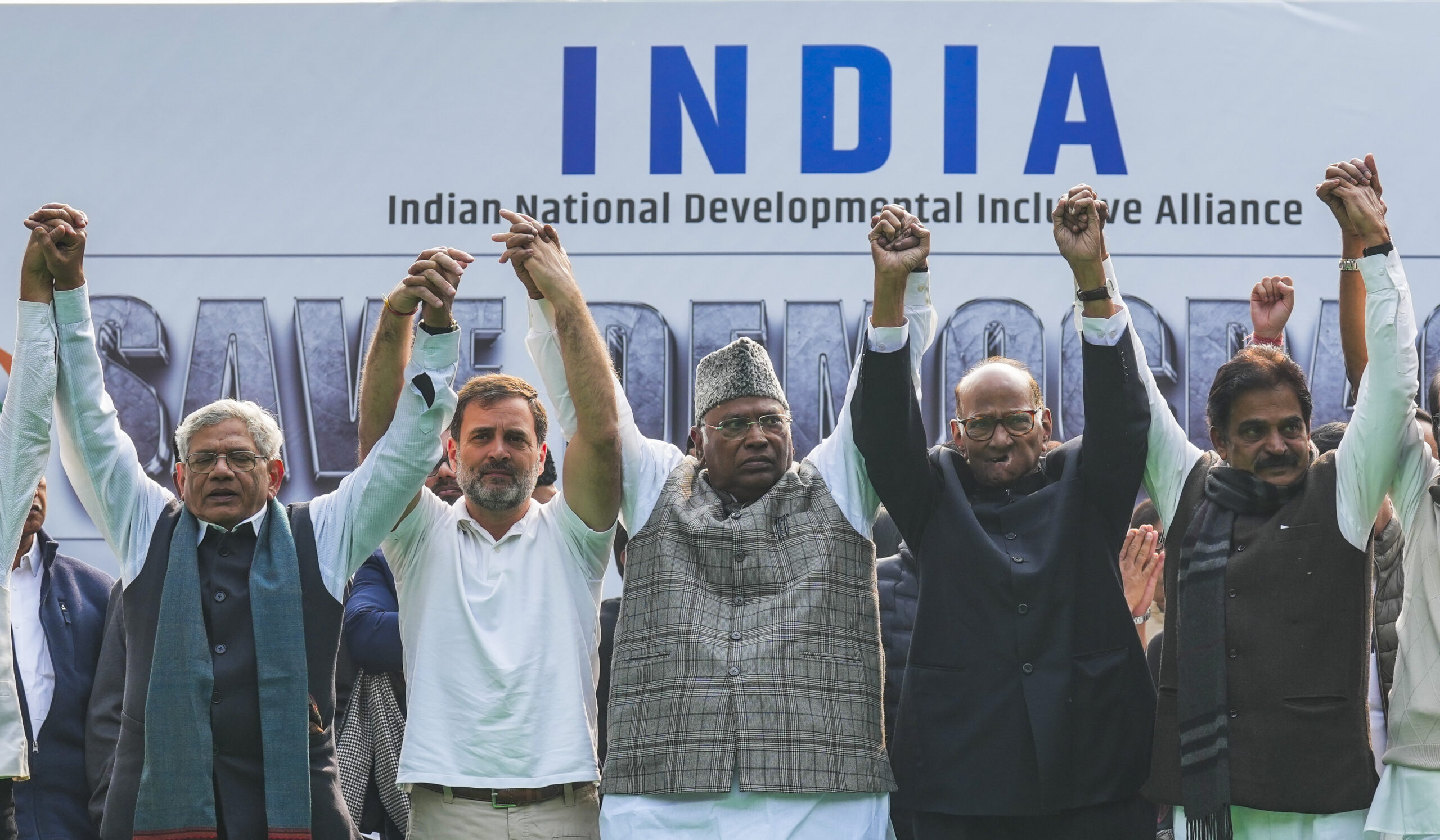 विपक्षी गठबंधन इंडिया यानी इंडियन नेशनल डेवलपमेंटल इन्क्लूसिव अलायंस के नेताओं ने सरकार पर ‘लोकतंत्र को खत्म करने’ की कोशिश का आरोप लगाया है। दरअसल खत्म हुए शीतकालीन सत्र के दौरान संसद के दोनों सदनों से 146  विपक्षी सांसदों को निलंबित कर दिया गया। विपक्ष ने इसके खिलाफ शुक्रवार को जंतर-मंतर पर विरोध प्रदर्शन किया। जहां विपक्षी गठंबधन के तमाम दिग्गज नेता जमा हुए। उन्होंने कहा कि लोकतंत्र बचाने के लिए ‘इंडिया’ गठबंधन के सभी नेता एकजुट हैं और प्रधानमंत्री मोदी अब अकेले कुछ नहीं कर सकते है। जंतर-मतंर पर आयोजित इस विरोध प्रदर्शन में कांग्रेस अध्यक्ष मल्लिकार्जुन खरगे, कांग्रेस नेता राहुल गांधी, एनसीपी प्रमुख शरद पवार, सीपीएम महासचिव सीताराम येचुरी, आरजेडी नेता मनोज झा समेत कई पार्टियों के नेताओं ने हिस्सा लिया और सरकार पर जमकर हमला बोला।