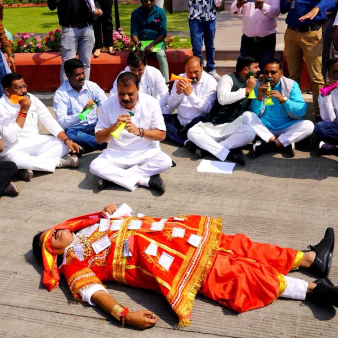 विधानसभा सत्र के सातवें दिन गुरुवार को महिदपुर से कांग्रेसी विधायक दिनेश जैन बोस कुंभकरण के गेटअप में विधानसभा पहुंचे. उन्होंने सडक़ पर लेटकर सरकार पर परिवहन घोटाले और बेरोजगारी के मुद्दे पर चुप्पी साधने का आरोप लगाया.
