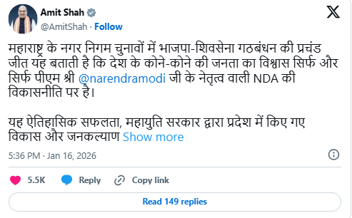चंद्रपुर कांग्रेस के लिए राहत की बात थी, जहां वह 30 सीटों पर और भाजपा 23 सीटों पर आगे थी. चुनाव में कुछ अप्रत्याशित परिणाम भी देखने को मिले, जैसे जालना में, जहां गौरी लंकेश हत्याकांड के आरोपी श्रीकांत पंगारकर ने निर्दलीय उम्मीदवार के रूप में चुनाव जीता. मुंबई में वार्ड नंबर 10 से भाजपा के जितेन्द्र पटेल को विजेता घोषित किया गया. वार्ड नंबर 3 से भाजपा नेता प्रवीन डरेकर के भाई प्रकाश डरेकर ने जीत हासिल की. BMC में कुल 227 सीटों के लिए मतों की गिनती जारी है. बाकी वार्डों के नतीजे आने में अभी समय लगेगा. केंद्रीय गृह मंत्री अमित शाह ने महाराष्ट्र के नगर निगम चुनावों में भाजपा-शिवसेना गठबंधन की शानदार जीत पर अपनी खुशी जताई. उन्होंने कहा कि यह जीत दर्शाती है कि देश के हर कोने की जनता प्रधानमंत्री नरेंद्र मोदी के नेतृत्व वाली NDA की विकासनीति पर भरोसा रखती है.