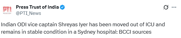 Shreyas Iyer Injury Update: भारतीय टीम के स्टार खिलाड़ी श्रेयस अय्यर ऑस्ट्रेलिया के खिलाफ मैच में कैच लेते समय चोटिल हो गए थे जिसके बाद से उन्हें ICU में भर्ती किया गया था और अब उन्हें लेकर अपडेट सामने आया है.