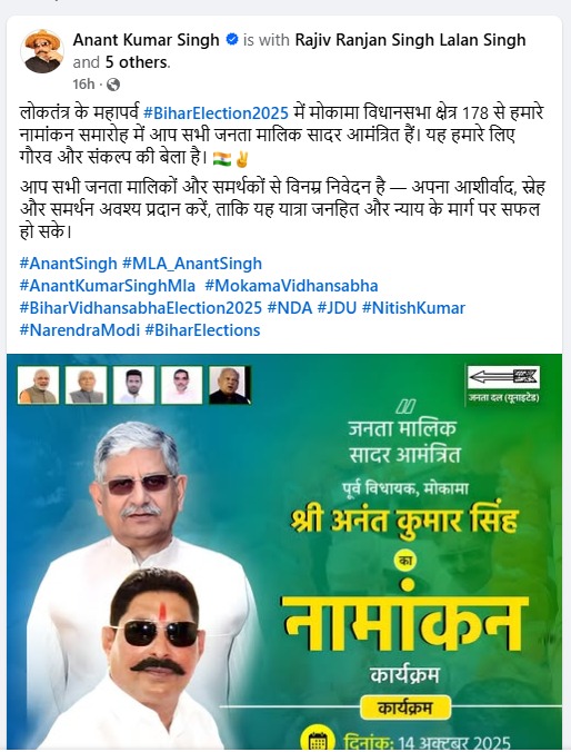 अनंत सिंह ने सोशल मीडिया फेसबुक पर एक पोस्ट कर चुनाव लड़ने की जानकारी दी है. इस दौरान उन्होंने लोगों को अपने नॉमिनेशन में आने का खुला न्योता दिया है. सीट बंटवारे और कैंडिडेट लिस्ट आने से पहले ही उन्होंने खुला एलान करते हुए पोस्ट में लिखा कि लोकतंत्र के महापर्व बिहार विधानसभा चुनाव 2025 में मोकामा विधानसभा क्षेत्र 178 से हमारे नामांकन समारोह में आप सभी जनता मालिक सादर आमंत्रित हैं. यह हमारे लिए गौरव और संकल्प की बेला है. आप सभी जनता मालिकों और समर्थकों से विनम्र निवेदन है कि आप अपना आशीर्वाद, स्नेह और समर्थन अवश्य प्रदान करें, ताकि यह यात्रा जनहित और न्याय के मार्ग पर सफल हो सके.