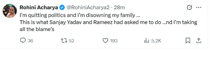 उन्होंने अपनी पोस्ट में लिखा, “मैं राजनीति छोड़ रही हूं और अपने परिवार से नाता तोड़ रही हूं. संजय यादव और रमीज ने मुझे यही करने के लिए कहा था. मैं सारा दोष ले रही हूं. मालूम हो कि संजय यादव RJD से राज्यसभा सांसद हैं और आरजेडी सुप्रीमो लालू प्रसाद के बेटे और उत्तराधिकारी तेजस्वी यादव के सबसे भरोसेमंद सहयोगियों में से एक हैं. रमीज को तेजस्वी का पुराना दोस्त बताया जाता है जो पड़ोसी राज्य उत्तर प्रदेश के एक राजनीतिक परिवार से ताल्लुक रखते हैं. आचार्य कुछ साल पहले अपने पिता को किडनी दान करने के लिए चर्चा में थीं. उन्होंने पिछले साल सारण से लोकसभा चुनाव लड़ा था, लेकिन उन्हें हार का सामना करना पड़ा था. यह अनुमान लगाया गया था कि वह प्रसाद के बड़े बेटे तेज प्रताप यादव को पार्टी से निकाले जाने से नाखुश थीं.