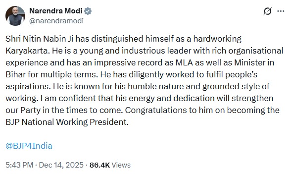 Nitin Nabin: भाजपा ने बड़ा फैसला लेते हुए रविवार को बिहार सरकार में कैबिनेट मंत्री नितिन नबीन को पार्टी का राष्ट्रीय कार्यकारी अध्यक्ष नियुक्त किया. भाजपा संसदीय बोर्ड ने नबीन को इस पद के लिए चुना. भाजपा के राष्ट्रीय महासचिव अरुण सिंह ने एक अधिसूचना में कहा कि भारतीय जनता पार्टी के संसदीय बोर्ड ने बिहार सरकार में मंत्री नितिन नबीन को तत्काल प्रभाव से भारतीय जनता पार्टी का राष्ट्रीय कार्यकारी अध्यक्ष नियुक्त किया है. नबीन की नियुक्ति पर प्रधानमंत्री मोदी ने उन्हें बधाई दी है. मोदी ने कहा कि नबीन के पास संगठन का लंबा अनुभव है. विधायक और मंत्री के रूप में नबीन का शानदार रिकार्ड है. भारतीय जनता पार्टी के संसदीय बोर्ड ने बिहार सरकार में मंत्री नितिन नबीन को पार्टी का राष्ट्रीय कार्यकारी अध्यक्ष नियुक्त किया है. पार्टी की ओर से जारी आदेश के अनुसार यह नियुक्ति तत्काल प्रभाव से लागू होगा. पार्टी की ओर से इस नियुक्ति को बिहार के साथ-साथ राष्ट्रीय राजनीति में भाजपा की रणनीतिक मजबूती के तौर पर देखा जा रहा है. नबीन कायस्थ समाज से आते हैं.