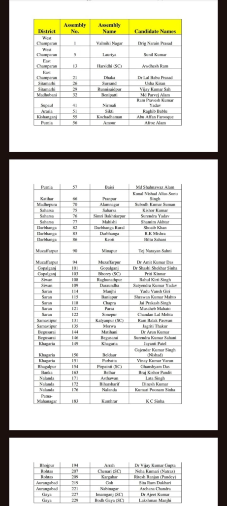 वहीं, सोनपुर से चंदन लाल मेहता, मोतिहारी से डॉ अरुण कुमार चुनाव मैदान में उतरेंगे. केवटी से बिल्लू साहनी, हरसिद्धि से अवधेश राम उम्मीदवार होंगे. इसके साथ ही बिहारशरीफ से दिनेश कुमार, पटना कुम्हरार से केसी सिन्हा उम्मीदवार होंगे. महिषी से समीम अख्तर, मीनापुर से तेज नारायण सहनी, कल्याणपुर से रामबालक पासवान चुनावी मैदान में डंका बजाएंगे. परबत्ता से बिनय कुमार वरुण, मांझी से वाईबी गिरी, मोरबा से डॉ. जागृति ठाकुर सहित 51 नाम जारी.