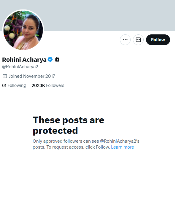 Rohini Acharya Turned X Account Private : RJD नेता और लालू यादव की बेटी रोहिणी आचार्य ने सोशल मीडिया पर विवादित पोस्ट के बाद अपने एक्स प्लेटफॉर्म को प्राइवेट कर दिया है. इसके बाद से बिहार की राजनीति में हलचल बढ़ गई है.19 सितंबर को रोहिणी ने अपने एक्स अकाउंट पर एक पोस्ट शेयर किया, जिसे लेकर अब बिहार में पारिवारिक मतभेद के आसार नजर आ रहे हैं. इसके बाद से उन्होंने अपने अकाउंट को फॉलोअर्स तक ही सीमित कर दिया है. आम लोग उनके पोस्ट नहीं देख पाएंगे.