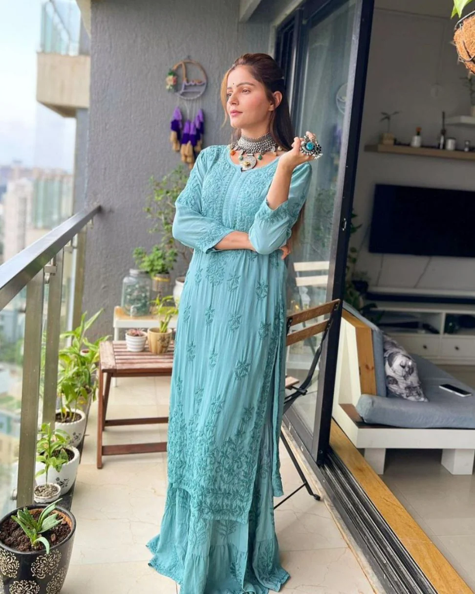 गुलाबी कलर और लॉन्ग फिट कट का कॉम्बिनेश बहुत ही शानदार लगता है. ऐसी चिकनकारी कुर्तिया न सिर्फ फॉर्मल लुक देती हैं, बल्कि ट्रेडिशनल फंक्शन पर भी खूब जचती है.